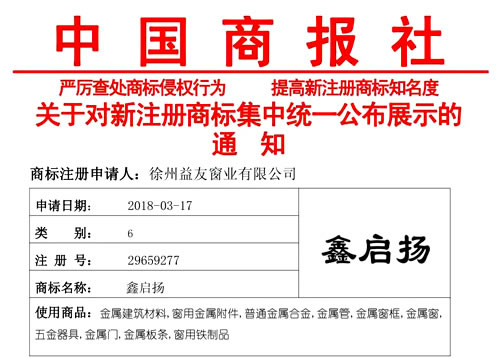 徐州益友門窗《鑫啟揚(yáng)》品牌已注冊商標(biāo)
